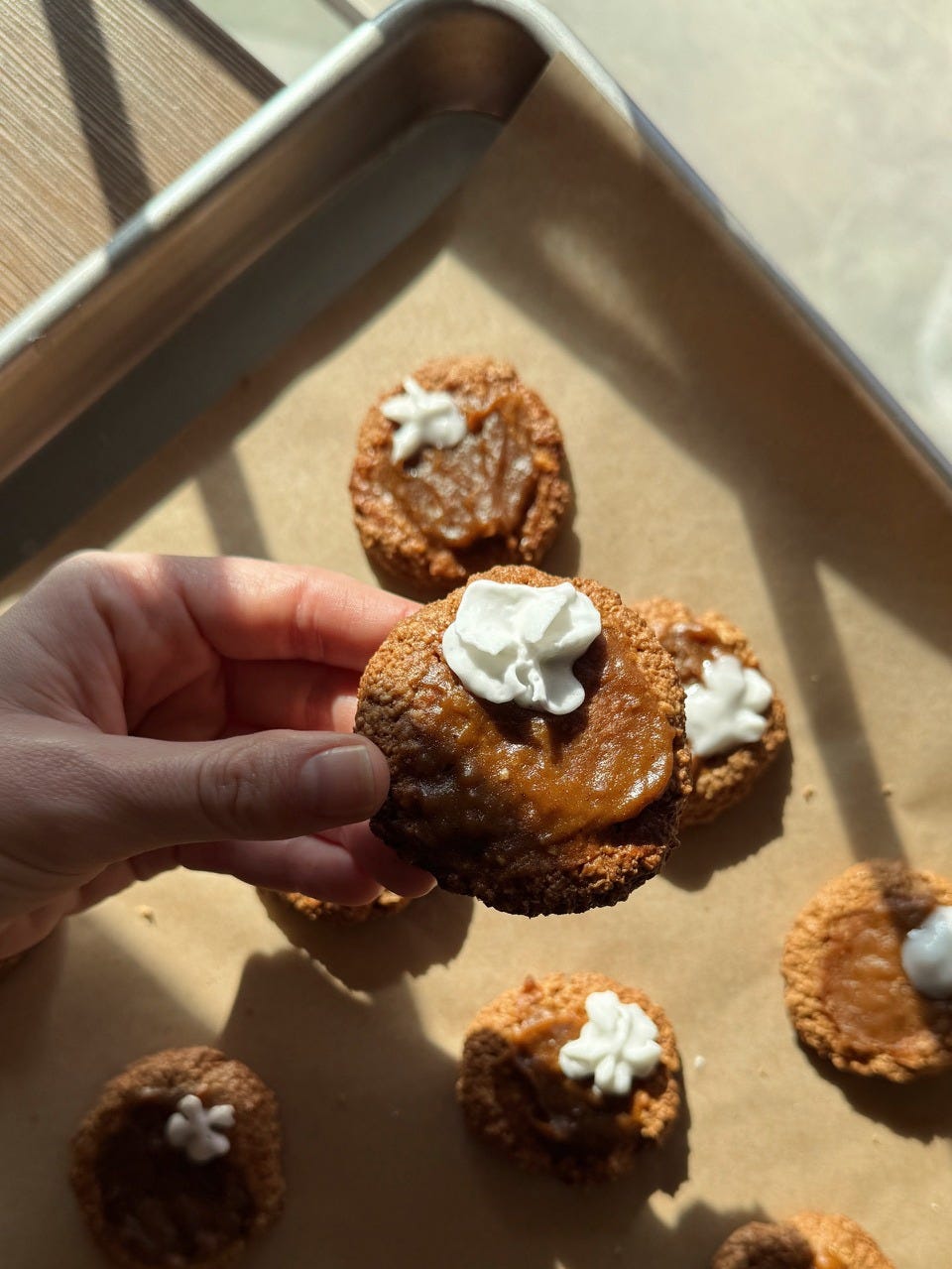 These are adorable and will definitely be popular on the dessert table. The cookie portion is made with oat flour, and the filling is a sweet potato custard. Top off right before serving with a tiny dollop of whipped cream or white icing.